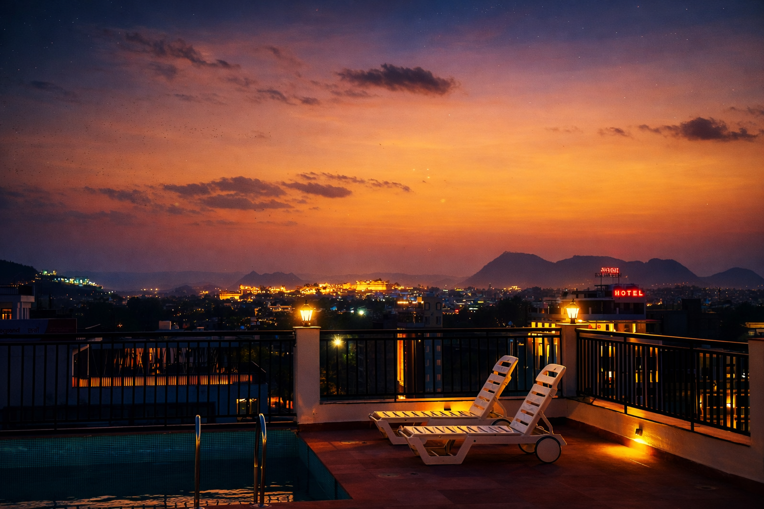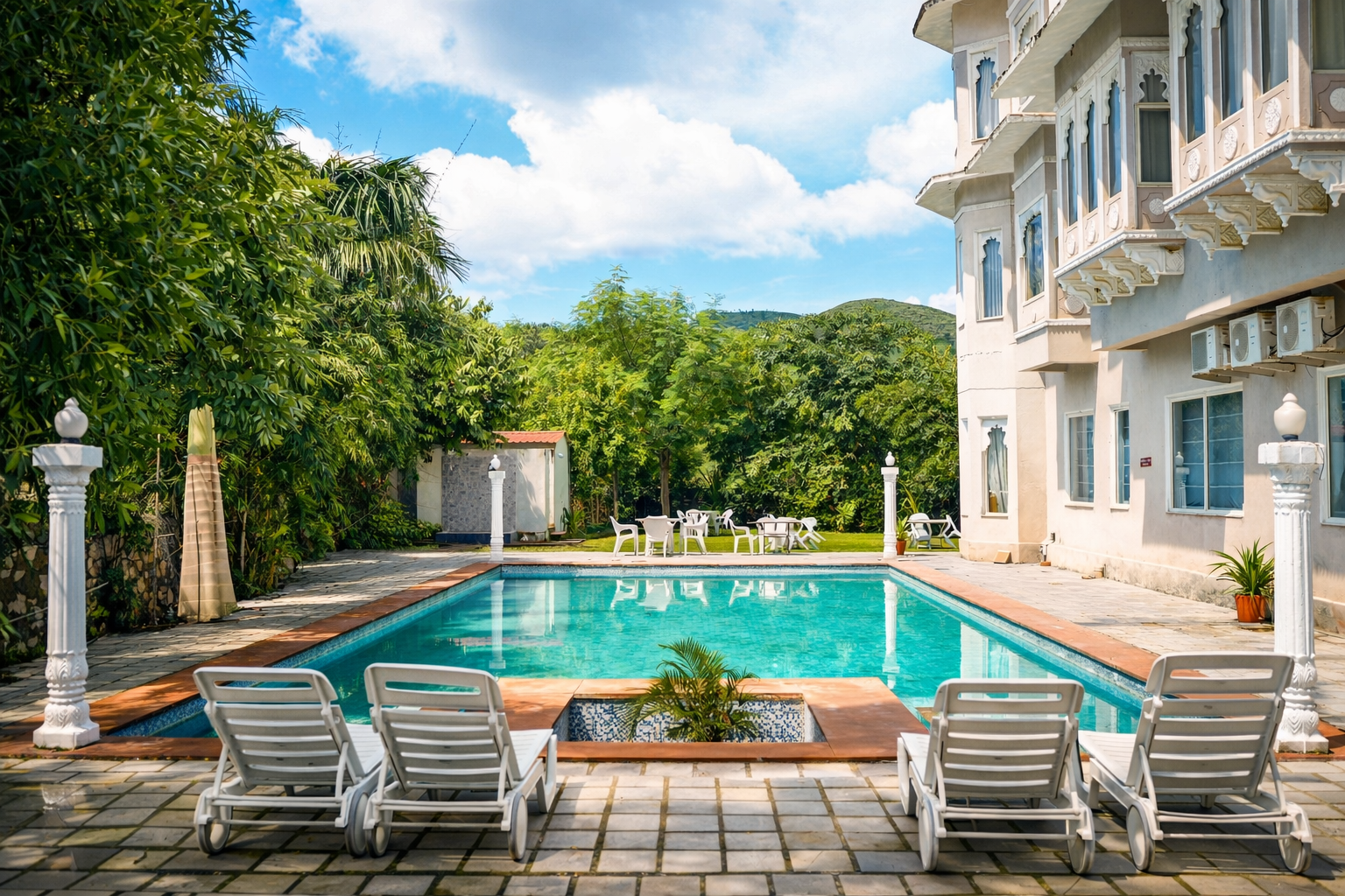 Luxurious hillside retreat offering panoramic Aravalli views.