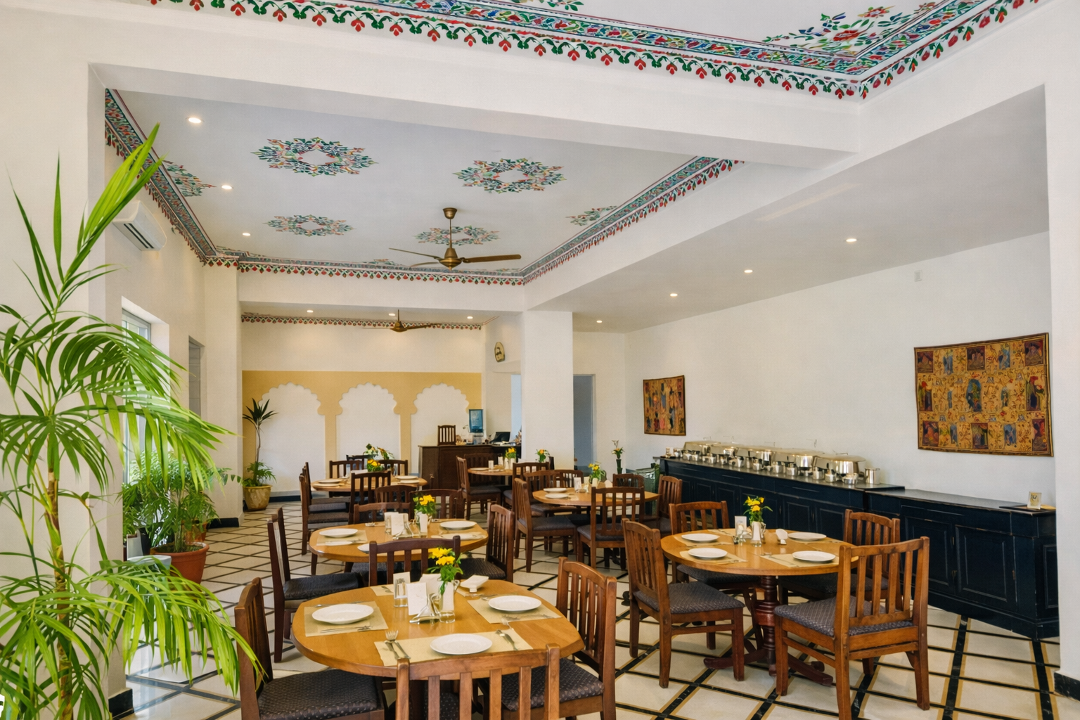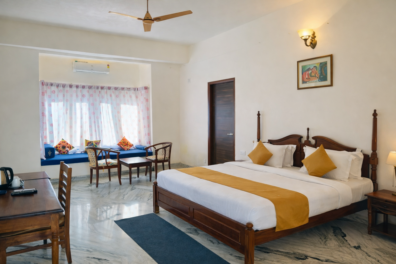 Our 21 spacious rooms, each spanning 440 sq. ft., are thoughtfully designed to reflect Indian heritage with contemporary elegance. Featuring king sized beds, cozy seating with traditional jharokha touches, modern amenities, and a semi private sit out area, the rooms comfortably accommodate up to five guests. Soft, subtle tones and scenic views create a restful space where you can truly relax and feel at home.